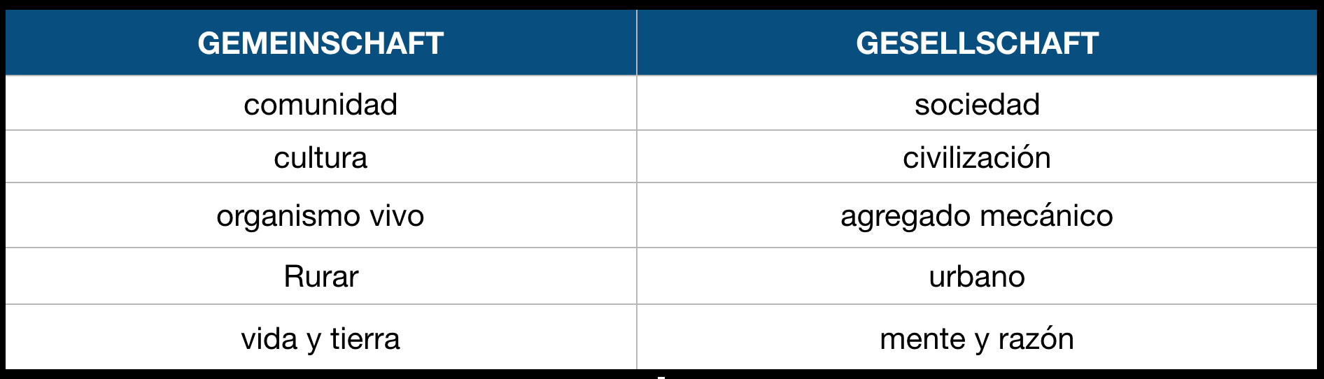 La distinción entre Gemeinschaft (comunidad) y Gesellschasf (sociedad) nos abre una reveladora ventana del mundo mental de la elite intelectual alemana (Bildungsbürger). El concepto de Gemeinschaft o “ comunidad” representaba todo aquello que valoraban y apreciaban, una autentica comunidad de individuos que compartían la misma lengua, cultura y raíces geográficas, por tanto, una comunidad formaba una unidad orgánica, una única raza o Volk. La educación en Bildung (uno de los objetivos del nuevo modelo universitario) quería ser una educación para la vida en una auténtica comunidad. Por otro lado, el término Gesellschaft o “sociedad” era simplemente una aglomeración de individuos aislados y sin lazos comunes, a excepción de la ciudadanía y un revestimiento superficial de modales civilizados. Las ciudades, especialmente las ciudades nuevas como Berlín, eran la viva imagen de las lacras de la sociedad. La población de las ciudades estaba constituida, en su mayoría, por extranjeros, inmigrantes desarraigados que buscaban saciar sus ambiciones materiales.